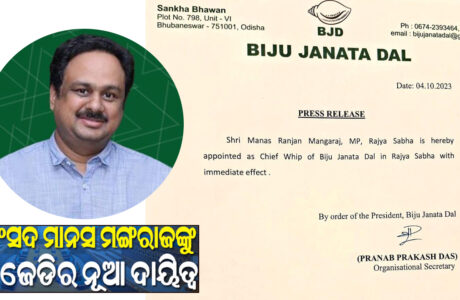 ବିଜୁ ଜନତା ଦଳ ତରଫରୁ ବିଜେଡି ସୁପ୍ରିମୋ ନବୀନ ପଟ୍ଟନାୟକ ରାଜ୍ୟସଭାରେ ବିଜେଡି ସଂସଦୀୟ ଦଳର ମୁଖ୍ୟ ସଚେତକ ଭାବେ ସାଂସଦ ମାନସ ମଙ୍ଗରାଜଙ୍କୁ ନିଯୁକ୍ତି ଦେଇଛନ୍ତିContinue Reading……