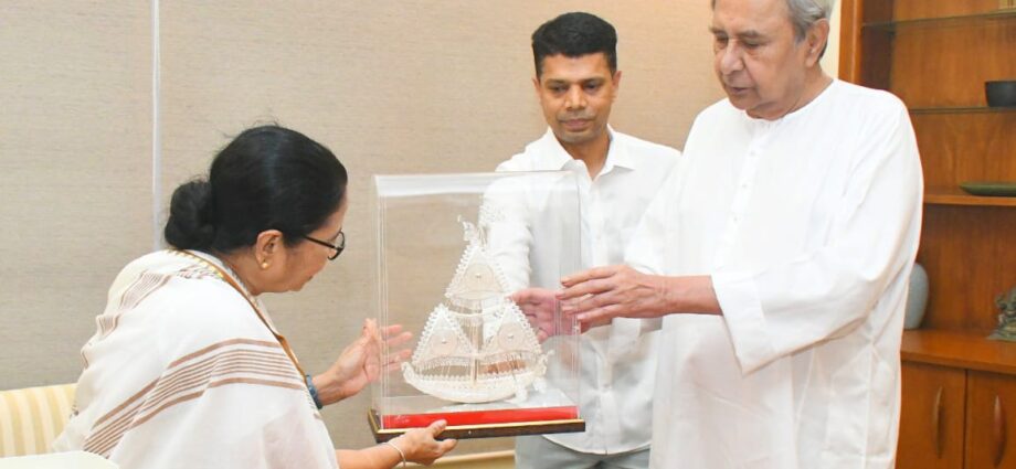 ଭୁବନେଶ୍ୱର: ଆଜି ଓଡ଼ିଶାର ମାନ୍ୟବର ମୁଖ୍ୟମନ୍ତ୍ରୀ ନବୀନ ପଟ୍ଟନାୟକଙ୍କୁ ନବୀନ ନିବାସଠାରେ ପଶ୍ଚିମବଙ୍ଗ ମୁଖ୍ୟମନ୍ତ୍ରୀ ମମତା ବାନାର୍ଜୀ ସାକ୍ଷାତ କରିଛନ୍ତି । ନବୀନ-ମମତା ସାକ୍ଷାତ ଆଲୋଚନା ସମୟରେ ମୁଖ୍ୟମନ୍ତ୍ରୀଙ୍କ ବ୍ୟକ୍ତିଗତ ସଚିବ ତଥା ୫-ଟି ସଚିବ ଭିକେ ପାଣ୍ଡିଆନ ମଧ୍ୟ ଉପସ୍ଥିତ ଥିଲେ। ମମତାଙ୍କୁ ଶ୍ରୀଜିଉଙ୍କ ଅଙ୍ଗବସ୍ତ୍ର ଦେଇ ସ୍ୱାଗତ କରିଥିଲେ ନବୀନ ପଟ୍ଟନାୟକ। ଏହା ସହ ମମତାଙ୍କୁ ତିନି ରଥର ରୂପାର ତିନୋଟି ପ୍ରତିକୃତି ଓ ଛେନାପୋଡ଼ ଉପହାର ଦେଇଛନ୍ତି ମୁଖ୍ୟମନ୍ତ୍ରୀ ନବୀନ ପଟ୍ଟନାୟକ ।
